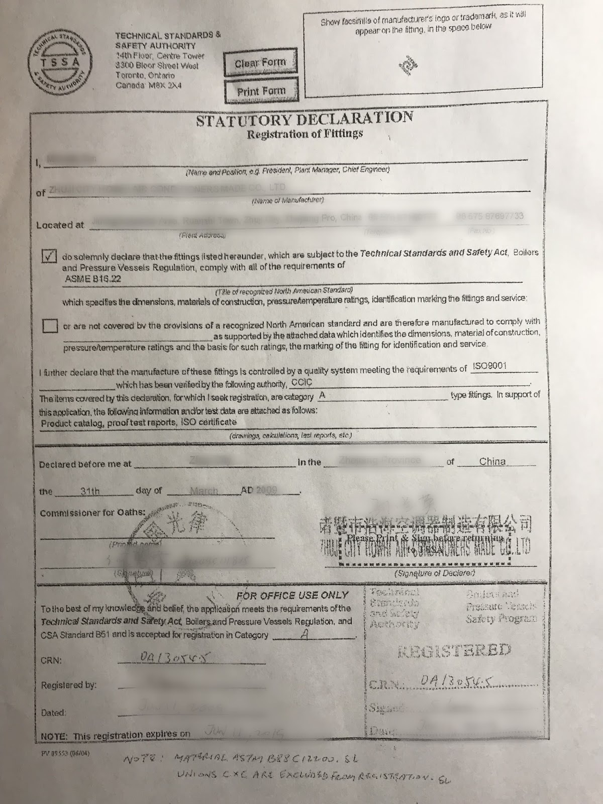 예를 들어 0A10333.5는 온타리오에 등록된 A Category Fittings를 의미합니다. 이때 CSA B51 4.2.7에 따라 같은 카테고리에 속한 제품이라면 모두 한 번에 등록을 할 수 있습니다. 예를 들어 티, 엘보우, 캡 등을 제작하는 업체는 제품별로 따로따로 등록할 필요가 없습니다. 모두 티, 엘보우, 캡 모두 Category A에 속하니 함께 등록을 할 수 있습니다. 물론 반대로 카테고리가 다를 경우에는 다른 회사라도 별도로 등록을 해야 합니다.