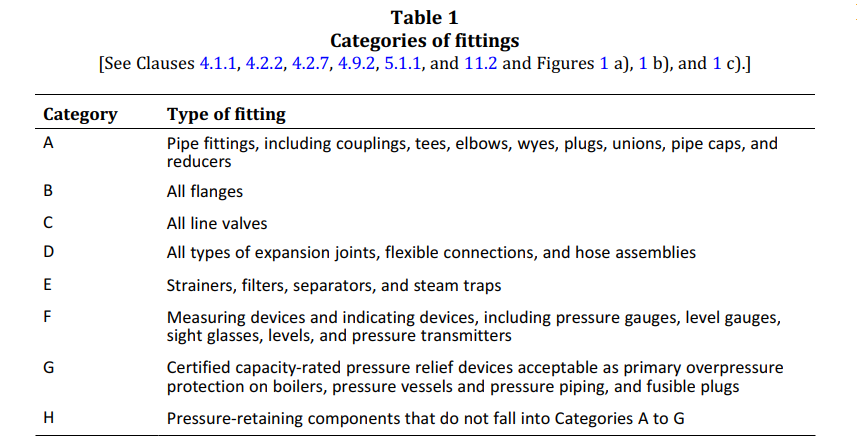 CSA B51에서 규정하고 있는 Fitting의 카테고리 (CSA B51 Table 1)
