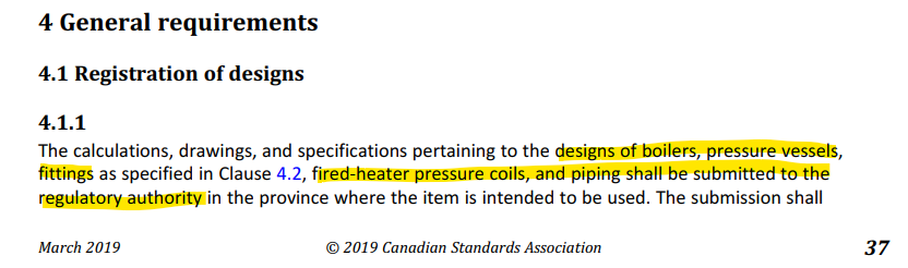 이 CSA B51 코드는 캐나다의 보일러, 압력용기 설계 코드라고 생각하시면 됩니다. 하지만 CSA B51는 주로 기술적인 내용보다는 행정적인 내용을 담고 있습니다. 즉, CSA B51은 보일러, 압력용기 설계 및 제작 시 ASME Boiler and Pressure Vessel Code를 따르도록 하고 있습니다. 다만, 그에 추가하여 몇 가지 요구사항이 정의되어 있는데 그것 중의 하나가 바로 '보일러, 압력용기, 피팅류, 히터 코일, 배관 디자인을 주 정부에 등록하여야 한다'는 것입니다.