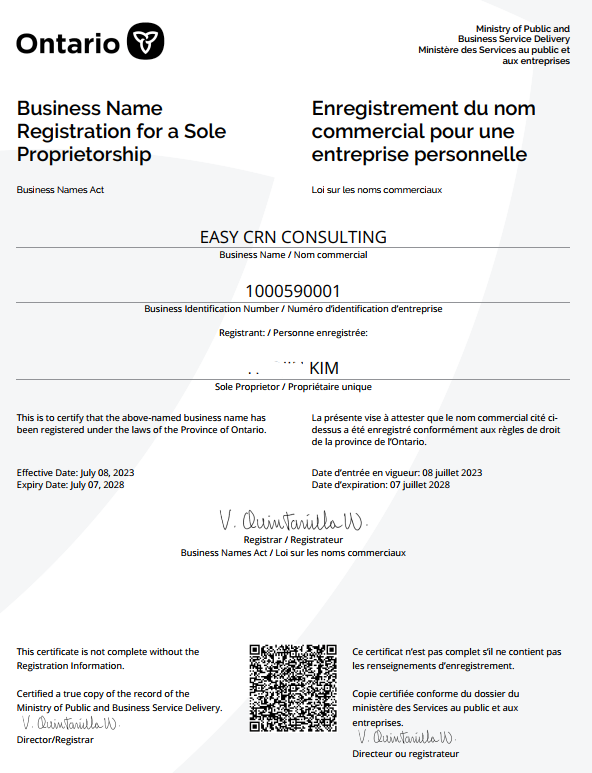 EASY CRN은 캐나다 온타리오에서 개인 사업자 등록을 한 후 업무를 진행하고 있습니다.